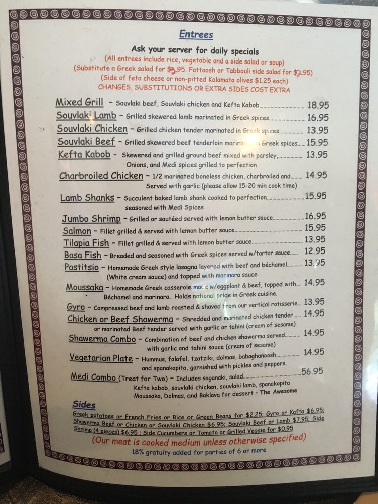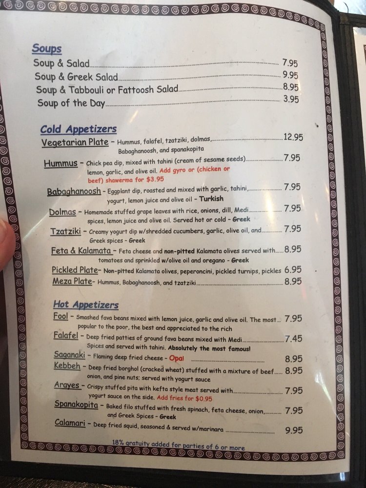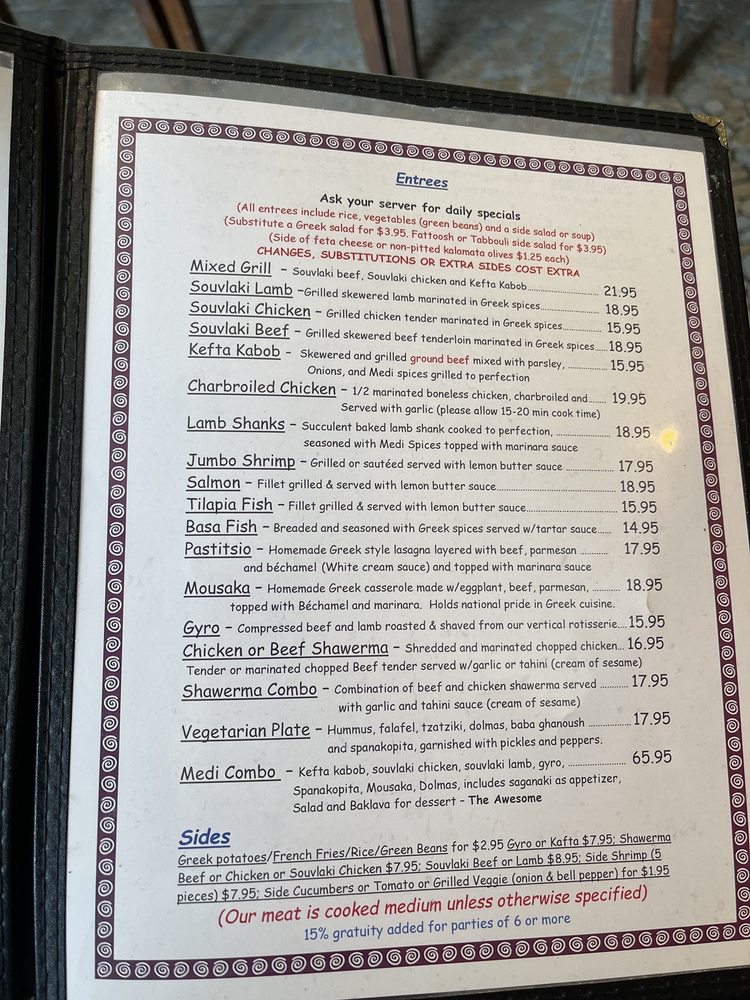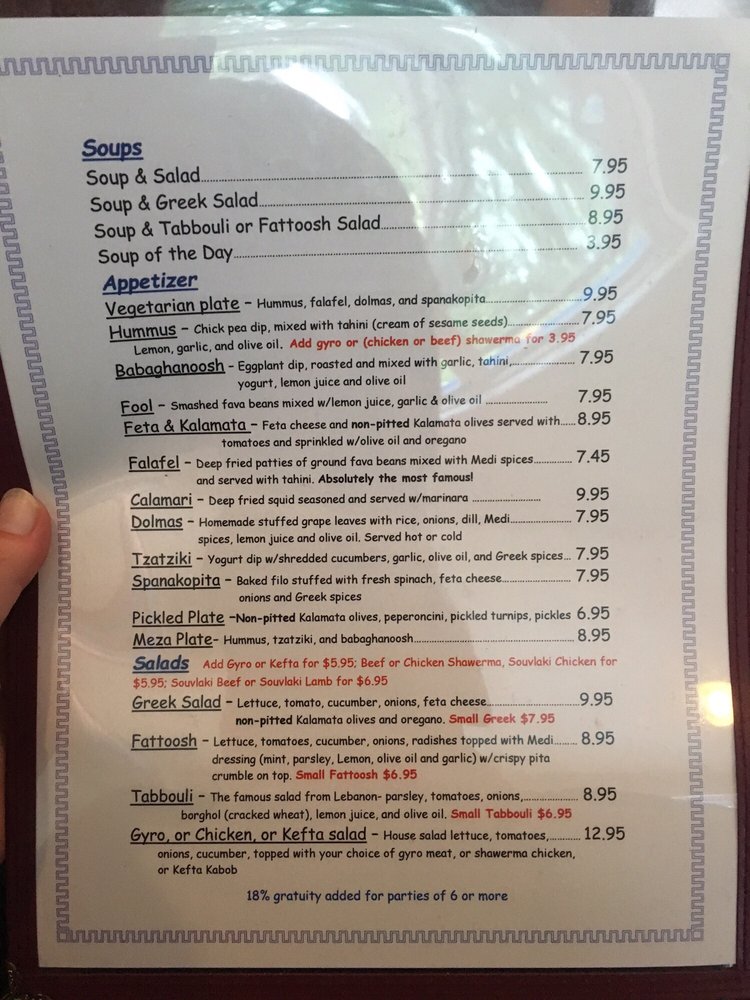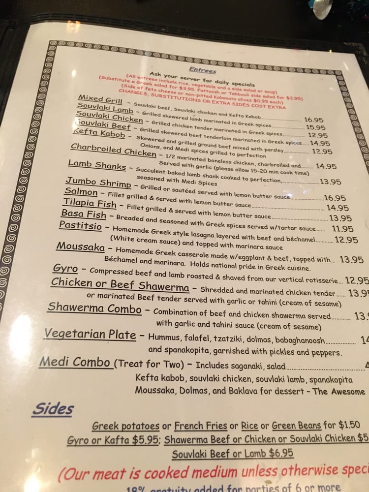 Kefta kabob, souvlaki chicken, souvlaki lamb, gyro, spanakopita, mousaka, dolmas, includes saganaki as appetizer, salad and baklava for dessert - the awesome.