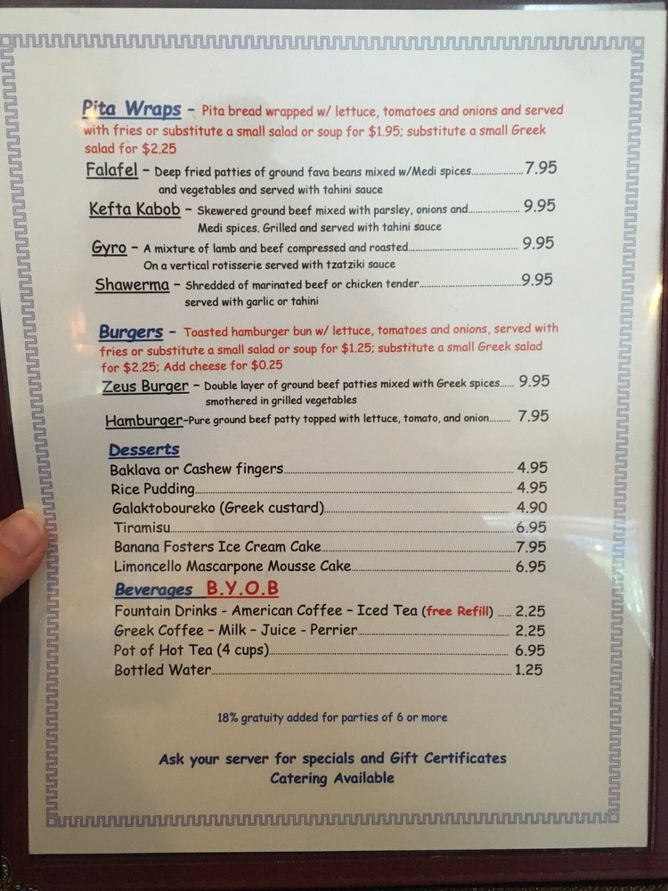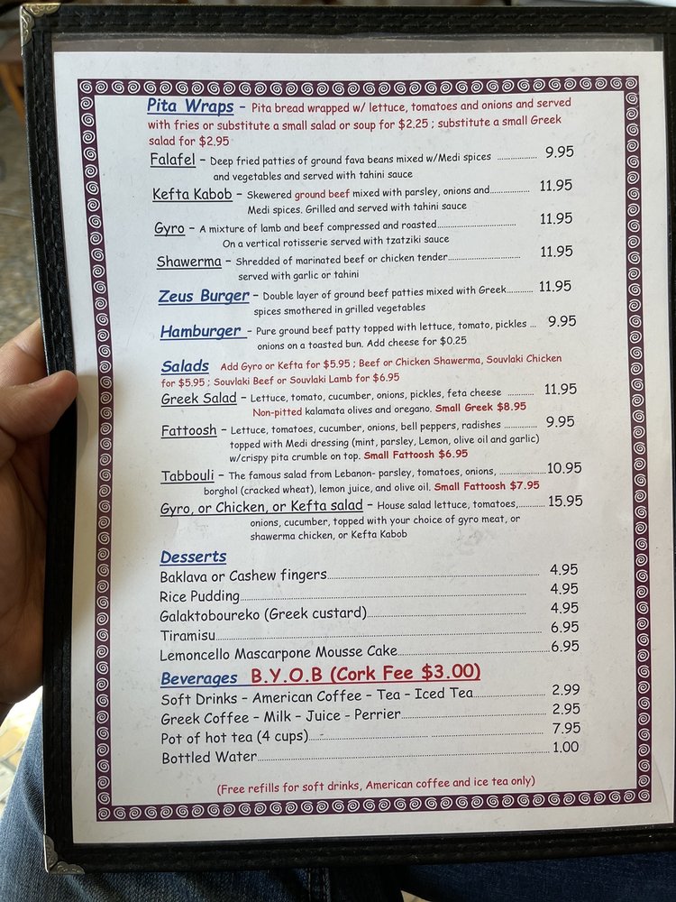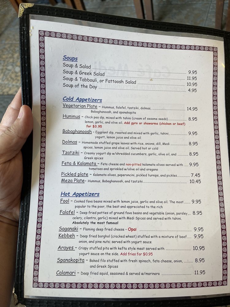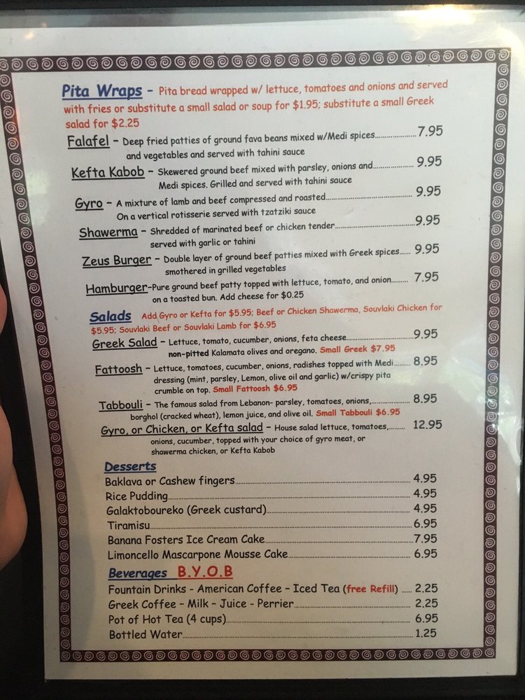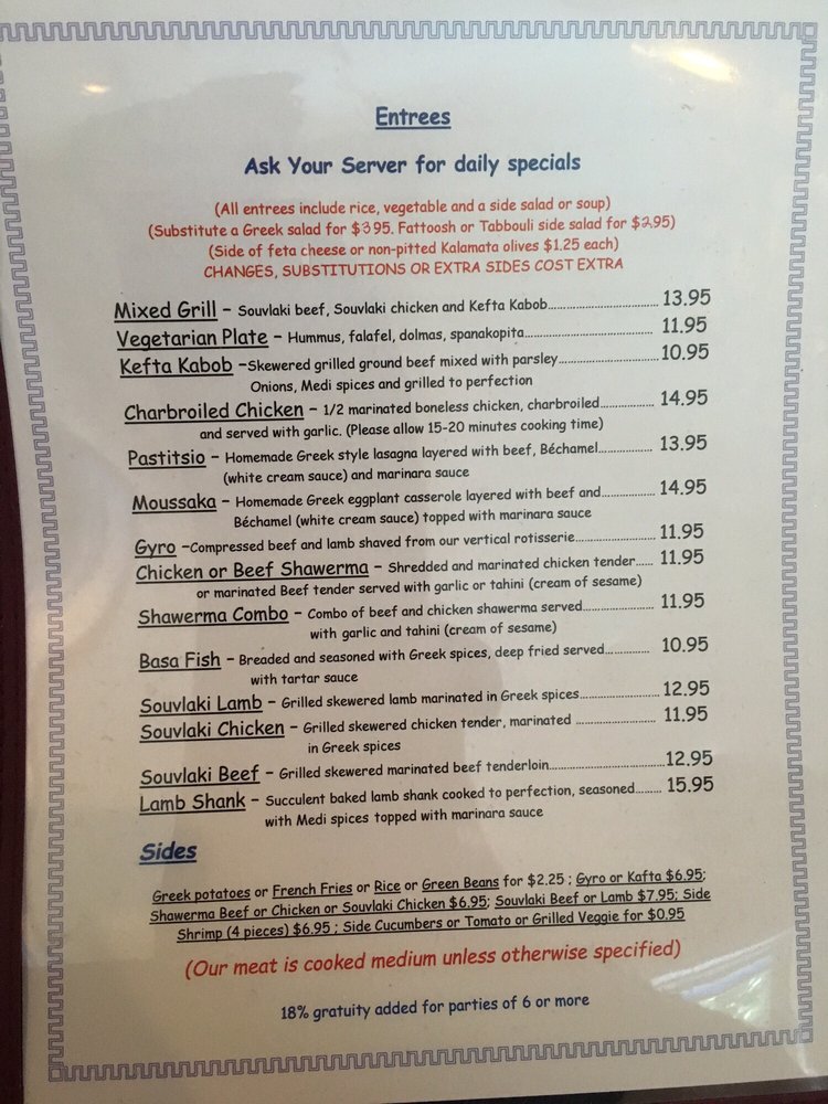 Kefta kabob, souvlaki chicken, souvlaki lamb, gyro, spanakopita, mousaka, dolmas, includes saganaki as appetizer, salad and baklava for dessert - the awesome.